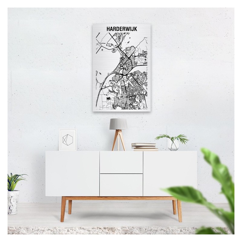 De stadskaart van Harderwijk in zwart wit geprint op Aluminium. Een perfecte aanvulling op je interieur. Deze afbeelding zal direct op Dibond aluminium van 3mm dik geprint worden en zal daardoor een luxueuze uitstraling hebben. Het materiaal is ook nog eens ontzettend duurzaam, het gaat bijvoorbeeld veel langer mee dan canvas.