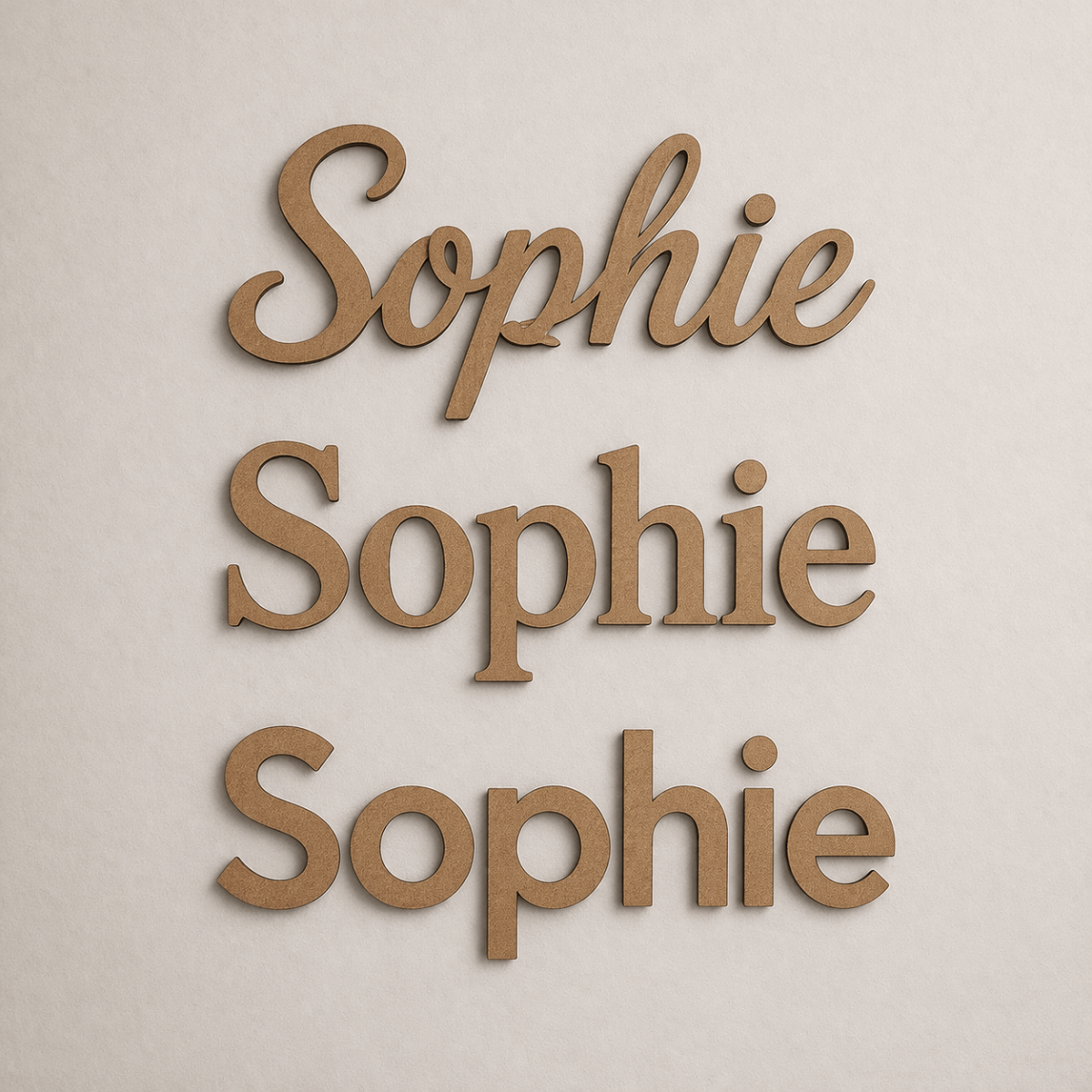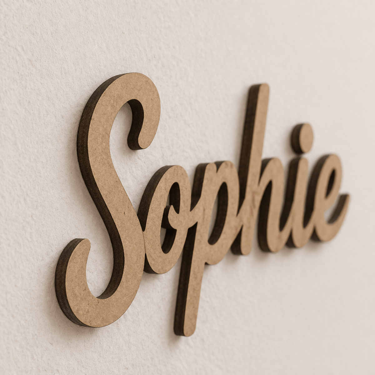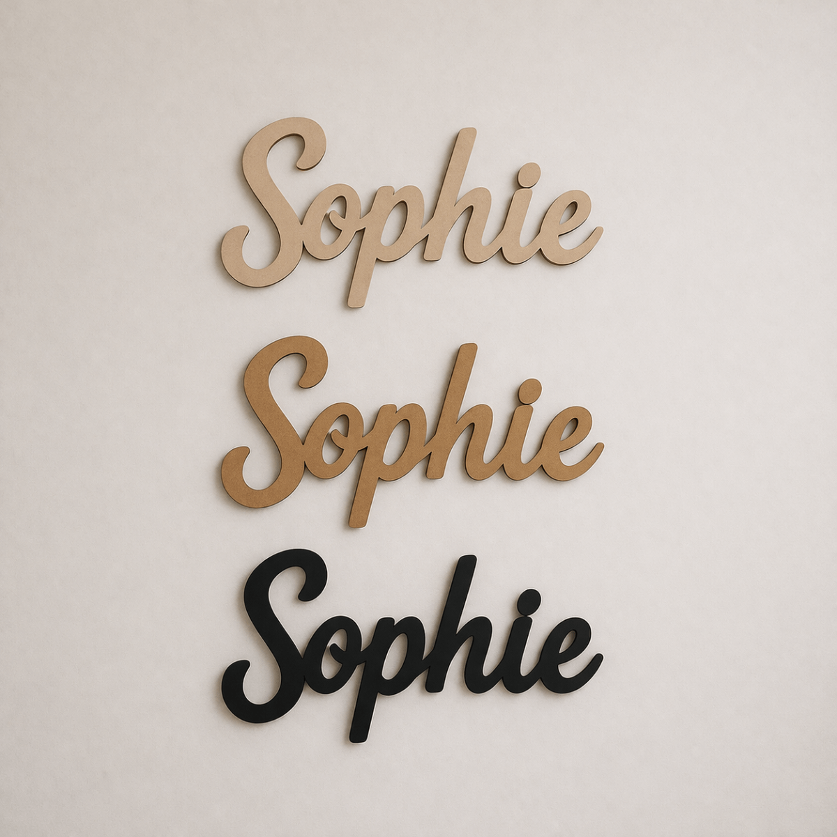 Je kunt kiezen uit materialen zoals MDF zwart, MDF bruin en Linoply. De houten tekst wordt lasergesneden uit materiaal van 9 mm dikte. Door dit snijproces krijgen de zijkanten een donkere afwerking. Dat zorgt voor een strak contrast en hoort bij de uitstraling van het product.