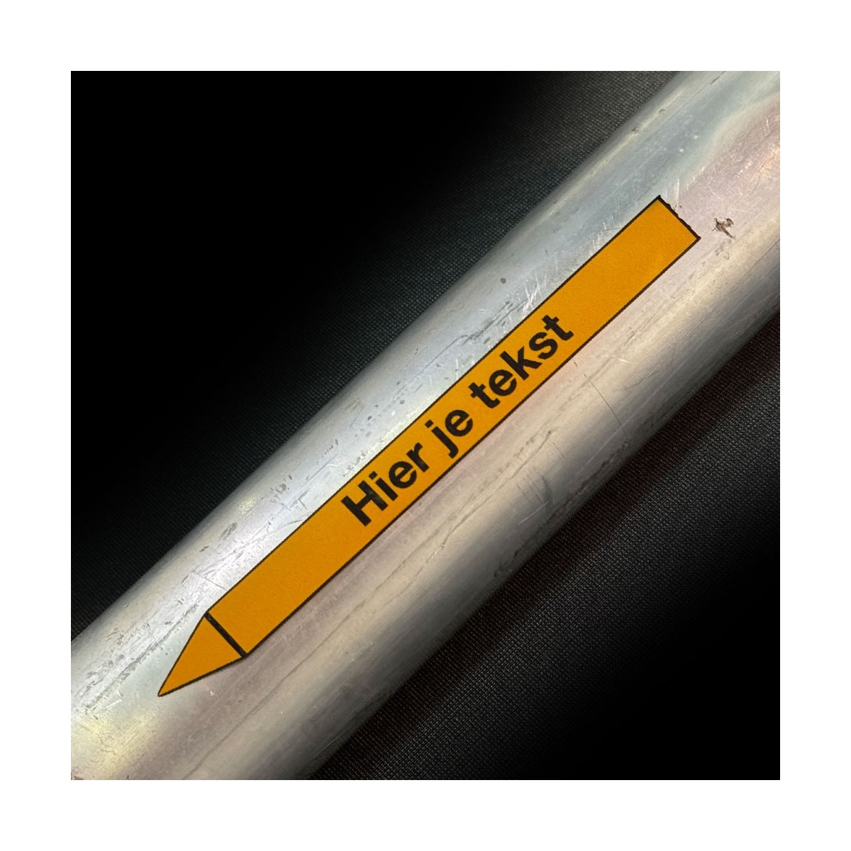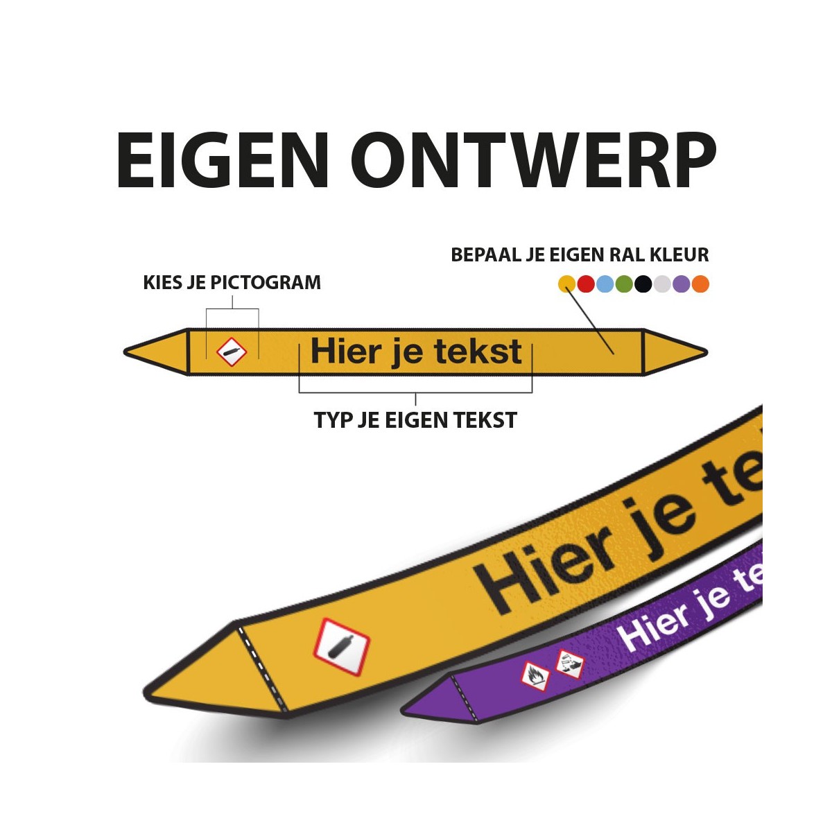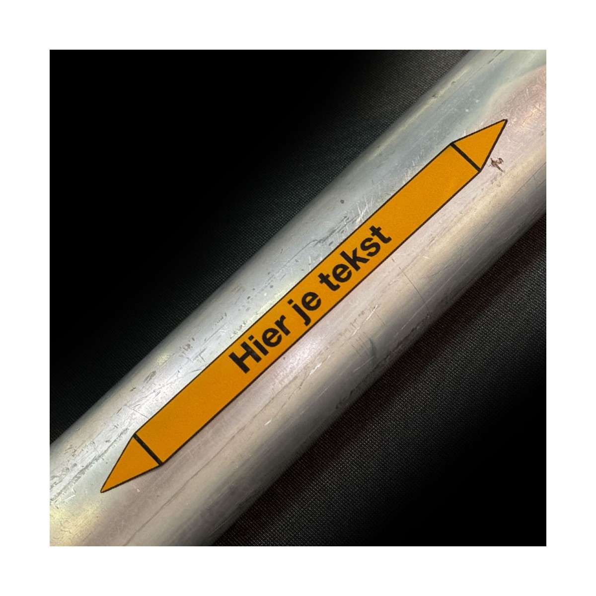 Je bepaalt volledig zelf welke informatie op de sticker komt te staan. Denk aan een medium zoals water of gas, een interne benaming of een duidelijke omschrijving. Met een pijl geef je de stromingsrichting aan. Voor extra herkenbaarheid kun je dit combineren met een pictogram.